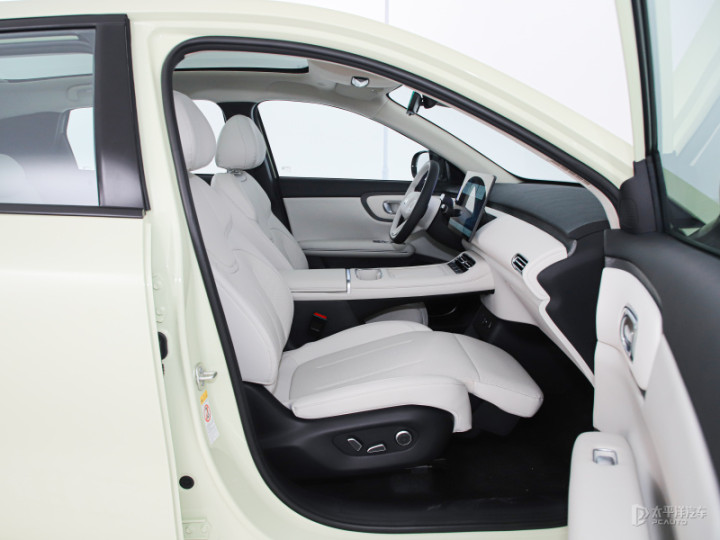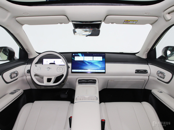 内饰方面,新车采用简约式设计风格,内部基本没有物理按键。采用双色拼贴设计,其中氛围灯灯带设置在两边门把手处。另外配有双拼色的三辐式方向盘以及怀挡设计,同时搭载悬浮式中控屏以及液晶仪表的组合。